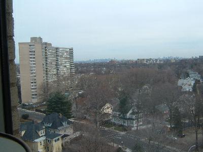 Looking out of our home in East Orange, NJ: the tiny point in the distance at the middle is the Empire State Building in NYC, 17 miles away. |